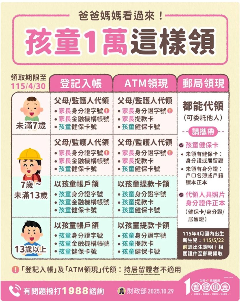 孩童須以自己的帳戶或提款卡領取,或自行至郵局臨櫃領現,也可委託他人(含父母或監護人)至郵局代領。